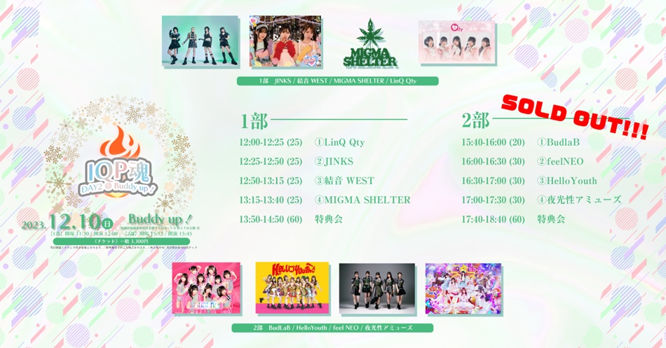 「IQP魂 〜winter special〜」DAY2 @ Buddy up!各部の終演簿特典会に関しまして、下記の2会場に分け実施させていただくこととなりました。