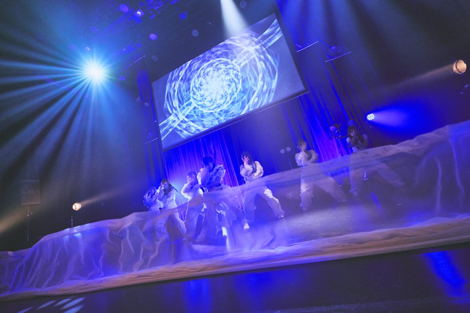 暗闇の中からステージに現れたのは、6人のダンサーを引き連れ、ポーズを決めるなっちゃんらしきシルエット。紗幕で、なっちゃんの表情やメンバーの顔ぶれはわかりませんが、天野なつファンならおなじみ、右手で顔を覆う決めポーズのあのナンバーであることは明らかです。イントロが流れ、クールかつ伸びやかに歌い始めるなっちゃん。天野なつ 7周年ライブ、『Don’t be shy』で幕開けです。