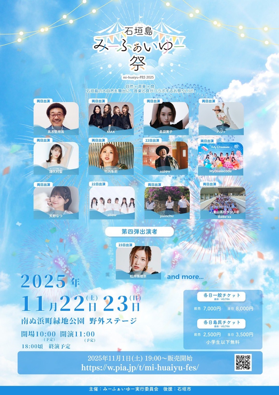 11月22日(土)・23日(日)沖縄県・石垣島にて開催される「石垣島 みーふぁいゆー祭」に天野なつが出演します。
