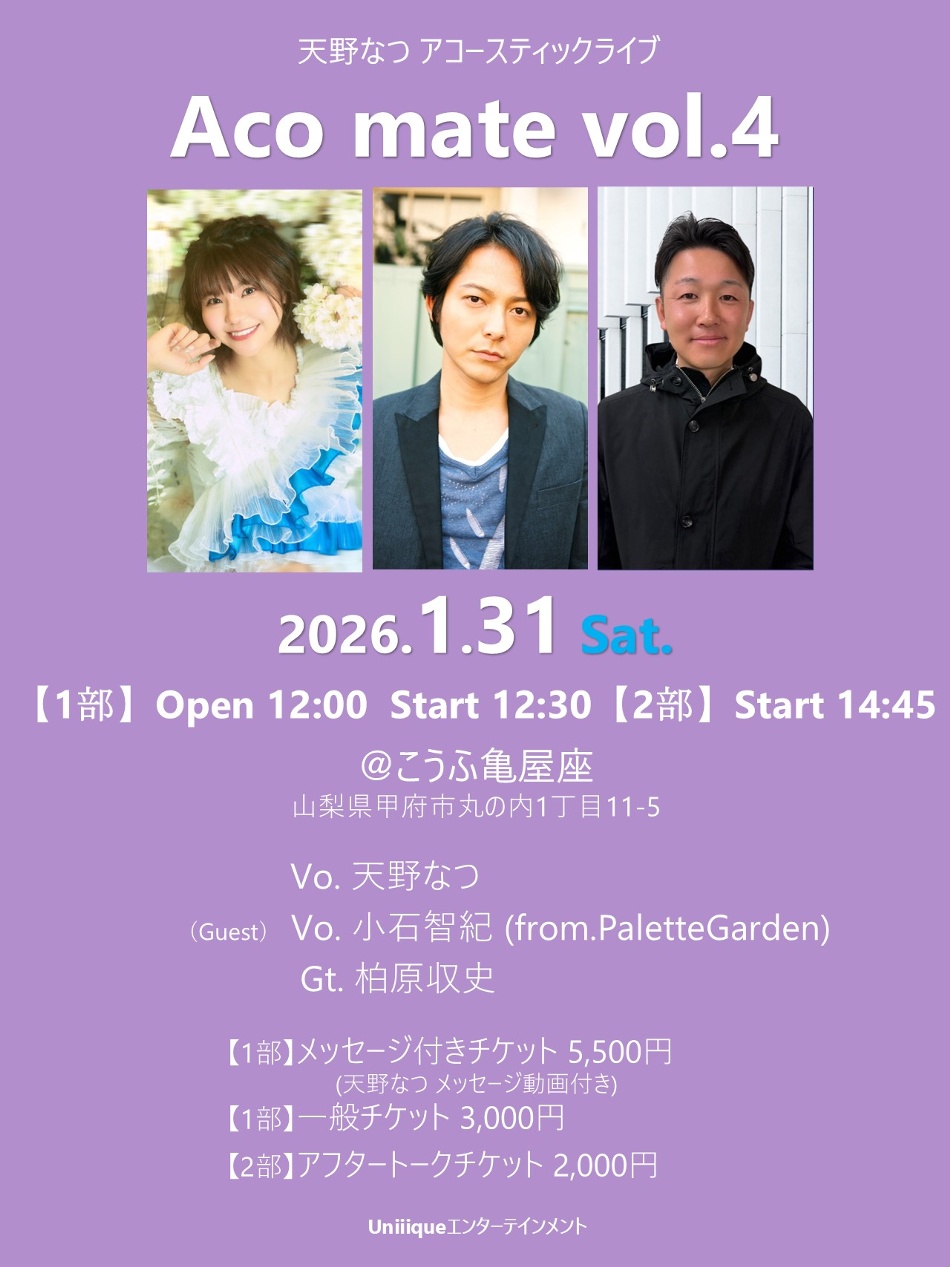 毎回ゲストさんをお迎えし共にライブを作り上げることでアコースティックで歌う仲間(mate)の繋がりを広げようというコンセプトから誕生したアコースティックライブ。オリジナル曲のアコースティックアレンジやゲストとのコラボも楽しめる内容になってます。