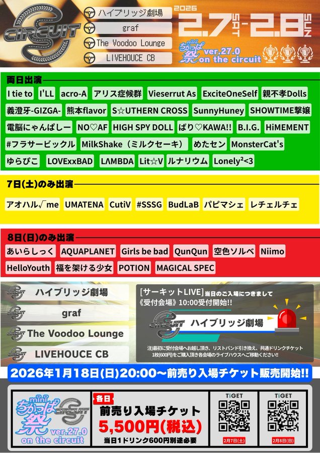 I tie to,I'LL,acro-A,アリス症候群,Vieserrut As,ExciteOneSelf,親不孝Dolls,義澄牙-GIZGA-,熊本flavor,S☆UTHERN CROSS,SunnyHoney,SHOWTIME撃嬢,電脳にゃんぱしー,NO♡AF,HIGH SPY DOLL,ばり♡KAWA!!,B.I.G.,HiMEMENT,#フラサービックル,MilkShake(ミルクセーキ),めたセン,MonsterCat's,ゆらぴこ,LOVExxBAD,LΛMBDA,Lit☆V,ルナリウム,Lonely²<3,