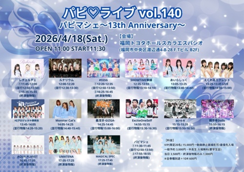 【イベント名】『パピ♡ライブ vol.140〜パピマシェ13th Anniversary〜』【開催日時】2026年4月18日(土)OPEN11:00 START11:30 IQプロジェクト研究生出演13:45-14:05 LIVE14:20-15:20 並行物販【会場】 福岡トヨタホールスカラエスパシオ(福岡市中央区渡辺通4-8-28 F.Tビル B2F)【出演】パピマシェ/#SSSG/レチェルチ...