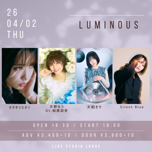 2026年4月2日(木) 【東京】 @LIVE STUDIO LODGE 開催 『LUMINOUS』 @ LIVE STUDIO LODGE 渋谷区代々木1-30-1 代々木パークビルB1 https://live-lodge.jp/access 4月2日(木) OPEN 18:30 START 19:00 【出演】 天野なつ Gt.柏原収史 / オダギリミオリ / 大和きり / Silent ...