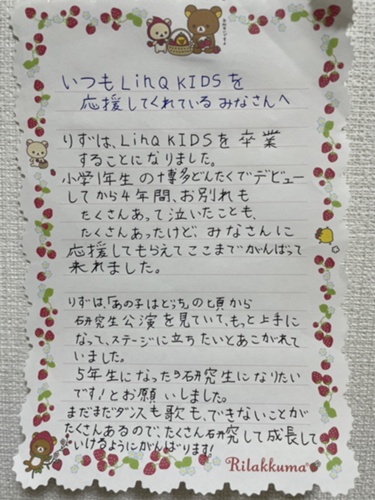 日頃より、LinQKIDSを応援頂きありがとうございます。先日開催致しました「LinQKIDS発表会2022」を無事に終え、活動を続けてまいりました、5年生のりず、みみに関しまして発表会を節目にLinQKIDSを卒業することとなりました。 りずは天真爛漫に明るいキャラクターでセンターとしてLinQKIDSを4年間引っ張り、ソロパートや曲のあおりをすることも多く、毎回一つ一つフレーズにたいして真剣...