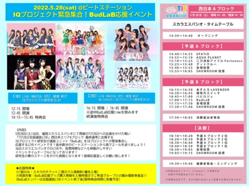《イベント名》「IQプロジェクト緊急集合!BudLaB応援イベント」 《開催日時》2022年5月28日(土)1部:開場12:15 / 開演12:452部:開場16:15 / 開演16:45 《出演》LinQ / 結音 WEST / MAGICAL SPEC / HelloYouth(2部のみ)オープニングアクト:IQプロジェクト研究生(織多莉鈴、海月らん、黒田さい、白雪夢乃、恋本みみ、高光杏奈、橘...