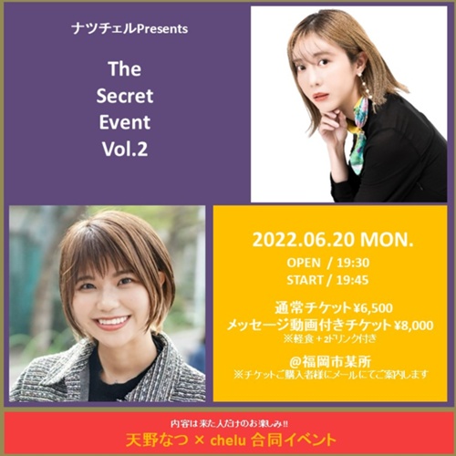 6月20日(日) 【福岡】@福岡市某所 天野なつ×chelu 合同イベント開催天野なつ×chelu 合同イベントナツチェルpresents 「The Secret Event vol.2」 6月20日(月) OPEN 19:30 START 19:45@福岡市某所 19:45~22:15 ●通常チケット 6,500円 軽食+2ドリンク付き ●メッセージ動画付きチケット 8,...