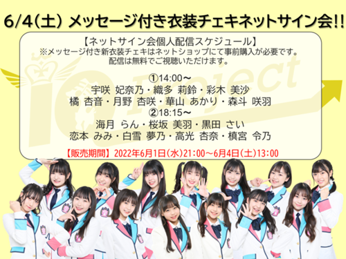 6/4(土) 「IQプロジェクト研究生4th公演 みちのりⅡvol.47・48 ~のびのび伸びろ7人公演~」の各公演終了後に、個別SHOWROOMチャンネルにてネットサイン会の開催が決定いたしました!!ネットサイン会では、メンバーがサインを書いている模様やフリートークなどを配信致します。各メンバーのチャネルフォローも宜しくお願い致します! 是非ともお楽しみください!! ★公演LIVE配信スケジュ...