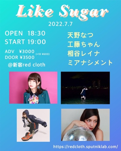 7月7日(木) 【東京】 @新宿レッドクロス 開催 『Like Suger』 @ 新宿レッドクロス 東京都新宿区新宿6-28-12 DS新宿ビルB1 https://redcloth.sputniklab.com/access/ 7月7日(木) OPEN 18:30 START 19:00出演 天野なつ (ソロ出演) / ミアナシメント / 相谷レイナ / 工藤ちゃん ●TICKET ADV &y...
