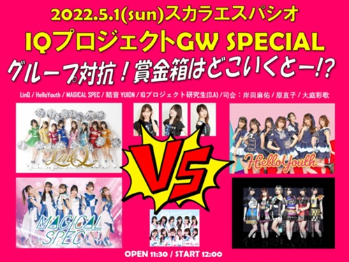 IQプロジェクトのグループ対抗の企画イベント! オープニングLIVEも有り!! 優勝チームは、フィナーレで1曲歌唱!更に日当日会場に設置させて頂きます、 お客様のご厚意により集められた賞金箱(全額)をGET。 賞金金額は果たして....白熱すること間違いなし!IQプロジェクト研究生はオープニングアクト出演させていただきます!《イベント名》IQプロジェクトGW SPECIAL 「グループ対抗~賞金箱...
