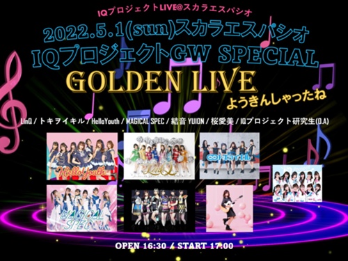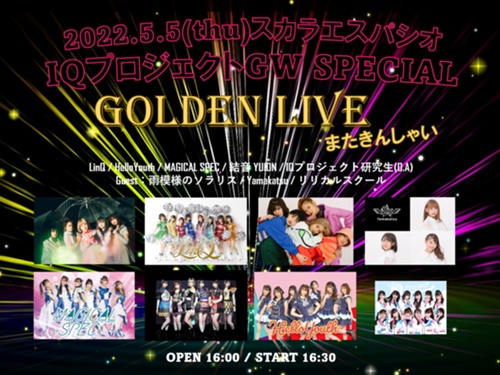 GW最終日を締めくくるLIVEイベント! IQプロジェクトが大集合し、更にゲストを迎えGOLDENなLIVEをお届けします!!!!《イベント名》IQプロジェクトGW SPECIAL 「GOLDEN LIVE またきんしゃい」《開催日時》5月5日(木・祝) 開場16:00 / 開演16:30《出演》LinQ,HelloYouth,MAGICAL SPEC,結音 YUION,IQプロジェクト研究生(...