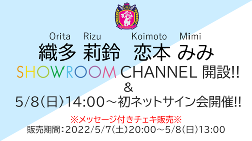 5月8日(日)【ネットサイン会】新メンバー 織多莉鈴・恋本みみSHOWROOMチャンネルにて初ネットサイン会開催!