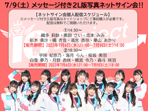 7/9(土) 「IQプロジェクト研究生4th公演 みちのりⅡvol.52・53 ~のびのび伸びろ7人公演~」の各公演終了後に、個別SHOWROOMチャンネルにてネットサイン会の開催が決定いたしました!!ネットサイン会では、メンバーがサインを書いている模様やフリートークなどを配信致します。各メンバーのチャネルフォローも宜しくお願い致します! 是非ともお楽しみください!! ★公演生配信スケジュール・...