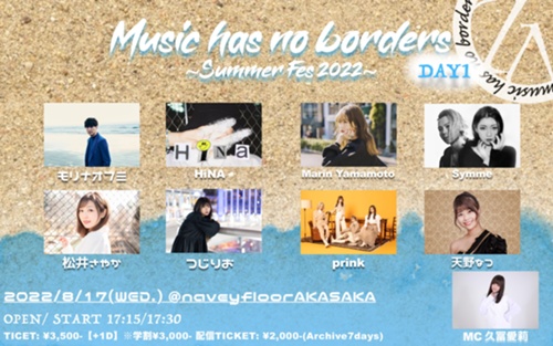 8月17日(水) 【東京】 @navey floor AKASAKA 開催 『Music has no borders』 ~Summer Fes 2022~ DAY1 @ navey floor AKASAKA 東京都港区赤坂2丁目14−1 赤坂山王会館 B1 https://navey-floor.com/access/ 8月17日(水) OPEN 17:15 START 17:30...