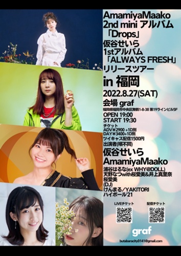 8月27日(土) 【福岡】 graf 開催 AmamiyaMaako2nd mini アルバム「Drops」 / 仮谷せいら1stアルバム「ALWAYS FRESH」リリースツアー in福岡 2022年8月27日(土) @graf https://www.fukuoka-graf.com/ 福岡市中央区舞鶴1-8-38 WAVE BLDS 5F OPEN 19:00 START 19:30LIVE...