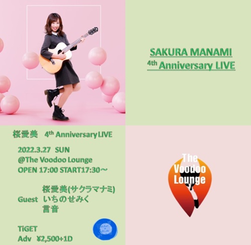 2022年3月27日(日) @Voodoo Lounge開催「桜愛美4th Anniversary LIVE」2022年3月27日(日) 【会場】 Voodoo Lounge 福岡市中央区舞鶴1-8-38 WAVE BLDG 4F https://voodoolounge.jp/ 開場 17:00 開演 17:30 【出演】 桜愛美 (サクラマナミ) guest: いちのせみく / 言音 【チケッ...