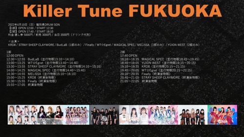 【イベント名】Killer Tune FUKUOKA【開催日時】2022年4月10日(日)【1部】OPEN 12:00 / START 12:30 【2部】OPEN 17:40 / START 18:10【会場】福岡DRUM SON【チケット情報】料金 通し券 5000円 / 前売 3000円 / 当日 3500円(ドリンク代別)【1部、通し券】https://tiget.net/events/1...
