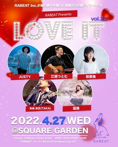 2022年4月27日(水) @SQUARE GARDEN開催RABEAT Presents 「LOVE IT vol.22」2022年4月27日(水) 【会場】 SQUARE GARDEN 福岡県福岡市中央区大名2丁目1−4-8F https://sgarden.jp/access.html 開場 18:30 開演 19:00 【出演】 ・桜愛美(サクラマナミ) / 温路 / 来嶋貴至...