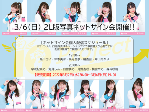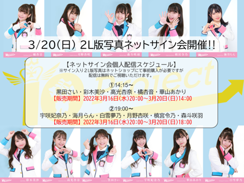 3/6(日) 「IQプロジェクト研究生4th公演 みちのりⅡvol.38・39~ソロ曲チャレンジ~」のライブ終了後、個別SHOWROOMチャンネルにてネットサイン会の開催が決定いたしました!!ネットサイン会では、メンバーがサインを書いている模様やフリートークなどを配信致します。各メンバーのチャネルフォローも宜しくお願い致します! 是非ともお楽しみください!! ★LIVE配信スケジュール・チャンネル...