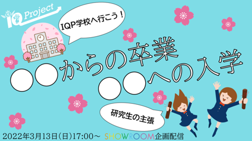 3月13日(日)IQP研究生公式SHOWROOMにて、企画配信開催決定!今回の配信は、、、「IQP学校へ行こう!~●●からの卒業 ●●への入学~」3月は卒業式、4月には入学式の季節。ということで、IQP研究生メンバー自身の卒業したいこと・これから始めたいことなどをテーマに配信していきます★配信後にはネットサイン会も開催♪「メッセージ付きセーラー服チェキネットサイン会」となります♡ぜひご参加下さい!...