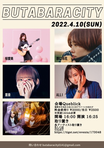 2022年4月10日(日) 「BUTABARACITY」 @Queblick「BUTABARA CITY」2022年4月10日(日) 【会場】 Queblick 福岡市中央区大名2-6-39ジラソーレ大名B1F http://www.queblick.com/ 開場 16:00 開演 16:25 【出演】 桜愛美 (サクラマナミ) ALLI antloop 原口玲花言音 (体調不良の為休演) タイ...