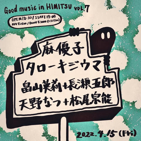 4月15日(金) 【福岡】 @ライブハウス秘密 開催 『Good music in HIMITHU vol.7』 @ライブハウス秘密 福岡市中央区大名1-3-29DAIMYO582ビル1F 地図 4月15日(金) OPEN 18:30 START 19:00 【出演】 天野なつ+松尾宗能 / 畠山英莉+長瀬五郎 / 麻優子 / タローキジウマ ※松尾宗能氏によるレゲエアレンジのカバー楽曲&レゲエバ...