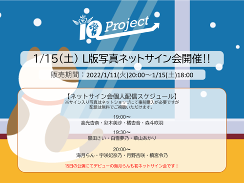 1/15(土) 「IQプロジェクト研究生4th公演 みちのりⅡvol.32・33~ソロ曲チャレンジ~」のSHOWROOM無料ライブ配信と、ライブ終了後、個別SHOWROOMチャンネルにてネットサイン会の開催が決定いたしました!!ネットサイン会では、メンバーがサインを書いている模様やフリートークなどを配信致します。販売期間は、2022年1月11日(火)20:00〜1月15日(土)18:00 2部のL...