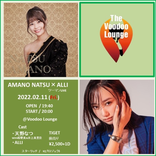 このご時世ですが、感染対策を万全に行い、予定通り開催いたします。 皆様ご協力の程、よろしくお願いいたします。2022年2月11日(金・祝) 【福岡】 @ Voodoo Lounge 開催 『天野なつ × ALLI ツーマンライブ』 @ Voodoo Lounge https://voodoolounge.jp/ 2月11日(金・祝) OPEN 19:40 START 20:00出演 ・...