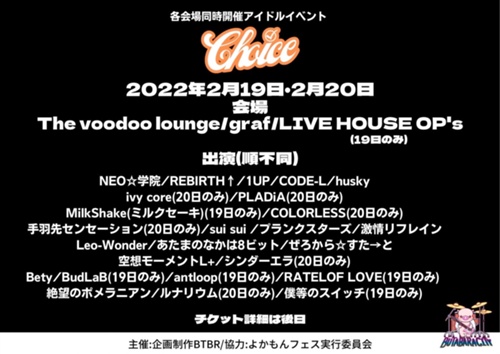 【開催日・イベント名】2月19日(土)・20日(日) 同時開催アイドルイベント「Choice」※BudLaBの出演は19日のみとなります。【会場】・The voodoo lounge 福岡県福岡市中央区舞鶴1-8-38 第19ラインビル4F ・graf 福岡県福岡市中央区舞鶴1丁目8−38 WAVE BLDG 5F ・OP's(19日のみ) 福岡県福岡市中央区天神3-4-19 ...