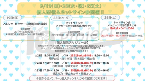 【訂正】 19日の個人配信時間、 「9/25(土)メッセージ付き衣装チェキ(BudLaBメンバーのみ)」の 販売時間を 2021年9月23日(木・祝)16:00〜変更致しました。9/19(日)・23(木・祝)・25(土)の「IQプロジェクト研究生4th公演 みちのりⅡ~争奪・七色選抜~」ライブ配信後、個人チャンネルにて配信&ネットサイン会を開催いたします!今回よりペアで配信をおこなっていましたメン...