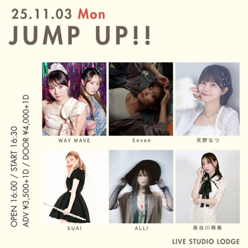 2025年11月3日(月祝) 【東京】 @LIVE STUDIO LODGE 開催 『JUMP UP!!』 @ LIVE STUDIO LODGE 渋谷区代々木1-30-1 代々木パークビルB1 https://live-lodge.jp/access 11月3日(月祝) OPEN 16:00 START 16:30 【出演】 WAY WAVE / Eevee / 天野なつ / SUAI / A...
