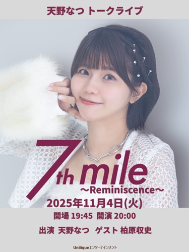 当日は7th mile LIVEを振り返りながらのトークがお楽しみいただけます。2025年11月4日(火) 【東京】 @ 会場未定天野なつ トークライブ 7th mile ~Reminiscence~ 《会場》 GrandAmi水道橋 東京都文京区本郷1-25-3フラワービル6階 https://maps.app.goo.gl/TXxkpKjt9GEm3W2e7 《日時》 2025年11月4日(火...