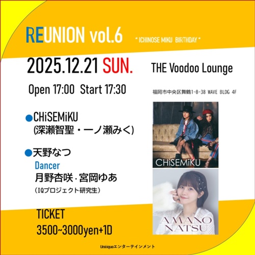 2025年12月21日(日) 【福岡】 THE Voodoo Lounge 開催 一ノ瀬みくBIRTHDAY 『REUNION vol.6』 @ THE Voodoo Lounge 福岡市中央区舞鶴1-8-38 WAVE BLDG 4F 12月21日(日) OPEN 17:00 START 17:30 【出演】 CHiSEMiKU (深瀬智聖・一ノ瀬みく) 天野なつ dancer月野杏咲・宮岡ゆ...