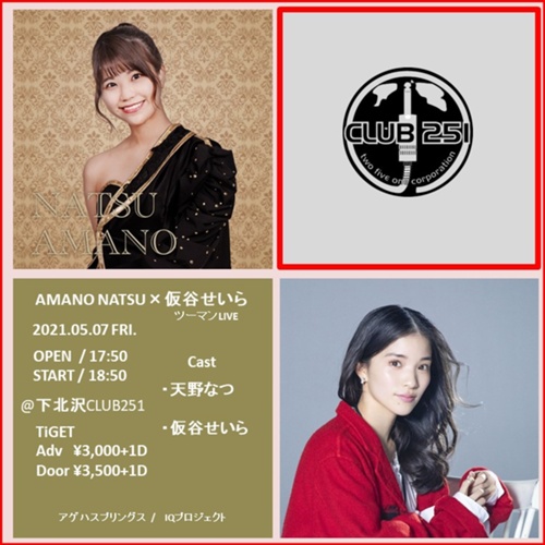 まん延防止等重点措置適応により変則的なタイムテーブルとなります。 ご理解とご協力の程、よろしくお願いいたします。 17:50 開場 17:50~18:50 前物販 18:50 開演 20:00 CLOSE 5月7日(金) 【東京】 下北沢CLUB251 『AMANO NATSU×仮谷せいら ツーマンLive』 @下北沢CLUB251 http://www.club251.com/acc...