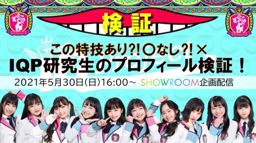 5/30 (日)IQP研究生公式SHOWROOMにて、企画配信開催決定! 今回の企画は、「IQP研究生のプロフィール検証!この特技あり⁈〇なし⁈×」 公式プロフィールにもとずいて 10名の特技は、本当に特技なのかを検証。 特技を披露しながら、皆で〇か×かで判断していく企画です!!今週末も元気いっぱい楽しく配信をお届けします! 是非ご視聴ください!! 企画配信終了後には、各メ...