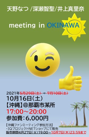 ・天野なつOKINAWA Output LIVE 2021 1部・2部公演延期日程 ・合同ファンミーティング延期開催 ・出演アーティストに関しまして。 ・その他、沖縄スケジュールが記載されております。 【沖縄県より協力依頼】 来県前にワクチン接種を完了するか、PCR検査又は、抗原検査による陰性を事前に確認してください。 ※来訪前に検査が受けられない方は、那覇空港にPCR検査等を受検できる体制を整備...
