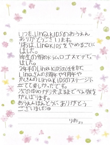 いつもLinQKIDSへ応援を頂きましてありがとうございます。今日までLinQKIDSとして活動を続けてまいりました、りおに関しまして、本人、親御様とのお話し合いを重ねた結果、本日1月31日でLinQKIDSを卒業することとなりました。 2020年に迎えたLinQKIDSの沢山の仲間と立った、IQプロジェクト年末大感謝祭の大舞台を無事に終え、次なるステージへ向けての練習がスタートする前に、この度の...