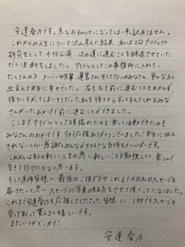 いつもIQプロジェクト研究生へ応援を頂きましてありがとうございます。 IQプロジェクト研究生として活動を続けてまいりました、安達春乃に関しまして、本人との話し合いを重ねた結果、来季の契約更新を行わないという結論に至り、1月31日をもちまして、契約解除という形で、IQプロジェクトを去ることとなりました。 これから新しい道へ進む安達春乃をどうか応援いただけますと幸いです。これまで応援を頂いてきました...