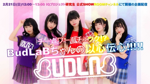 2/21(日)IQP研究生公式SHOWROOMにて、企画配信開催決定! 5名での初の企画配信!!!!!今回の企画は「チームワークチェック!?BudLaBちゃんの以心伝心!!!!!」2月28日(日)5名での初のLIVEスタートへ向け、企画配信でも心を一つに!ということで、5名のチームワークチェックをしちゃいます!ソーシャルディスタンスや、感染対策にも配慮し、5名で元気いっぱい楽しく配信をお届けします...