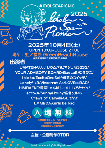 【イベント名】「IDOL SEA PICNIC 2025」【開催日時】2025年10月4日(土)OPEN 10:00 CLOSE 21:00【会場】佐賀県唐津市虹の松原GreenBeachHouse (佐賀県唐津市浜玉町浜崎 浜崎海岸)【出演】【出演者】順不同(24組) UMATENA ルナリウム パピマシェ #SSSG YOUR ADVISARY BOARD BudLaB ゆらぴこ I tie ...