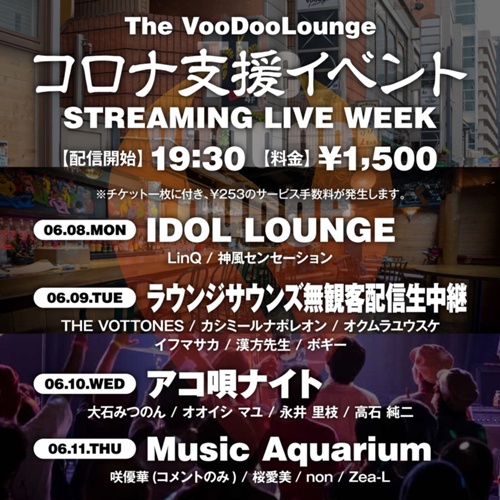 ・ 6月11日(木) 19:30~21:30 Voodoo Loungeコロナ支援 無観客LIVE配信~Music Aquarium編~ Voodoo Loungeコロナ支援 無観客LIVE配信~Music Aquarium編~ 2020年6月11日(木) 19:30~21:30予定 【チケット情報】Voodoo Loungeコロナ支援 無観客LIVE配信 (有料配信となります。)【有料配信】 配...
