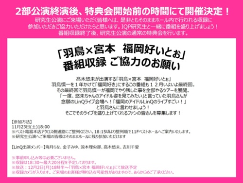 11月16日(土)【福岡】朝倉市のピーポート甘木・JA筑前あさくら本店周辺にて開催の農商工市民フェスティバル「第1回あさくら祭り」にIQプロジェクト研究生、選抜ユニット「BudLaB」11月メンバーで出演することが決定しました!Pステージでの「KBCふるさとWishスペシャル あさくら祭り 公開生放送 〜元気です!あさくら〜」への出演や、JステージでのミニLIVEなど盛りだくさんの内容で参加させて...