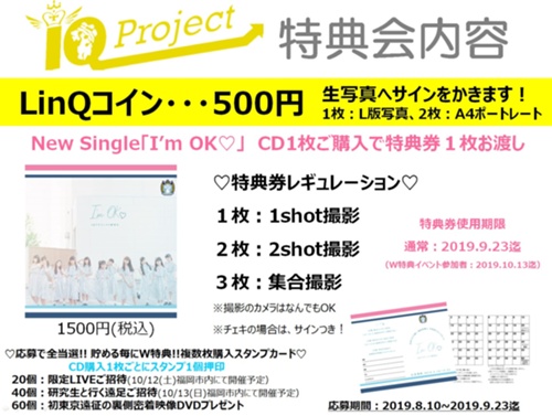【追加情報】9/23,28限定特典 「I'mOK♡」購入でリリース記念ポスタープレゼント!!ポスターはCD購入枚数分をプレゼント枚数の限度として、お好きな枚数をプレゼントさせて頂きます!! 9月28日(土)天神ベストホールにて9月定期公演の追加開催が決定しました!「IQプロジェクト研究生2nd公演~みちのり~vol.57」の詳細をお知らせ致します。皆様のご来場心よりお待ちしております。20...